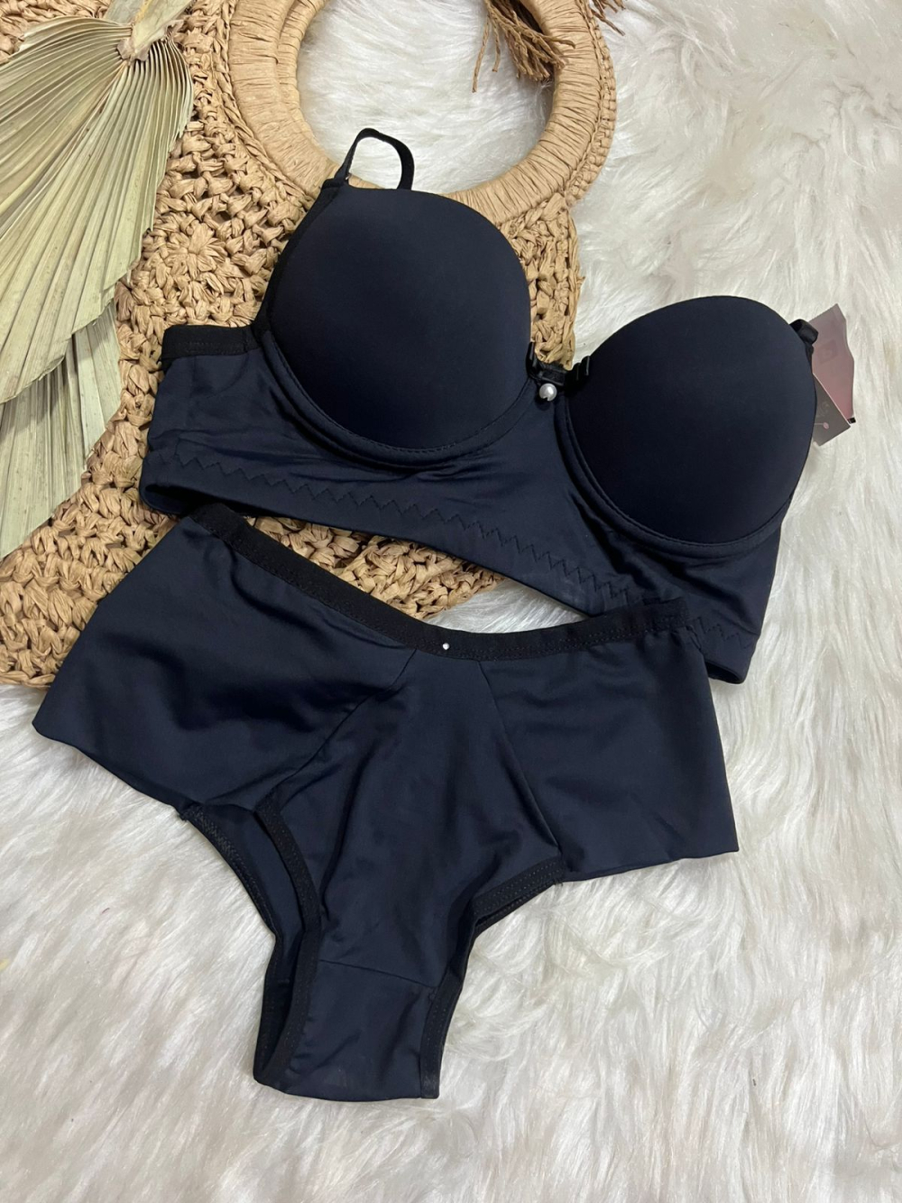 Conjunto com calcinha e sutiã com bojo sem bolha, em renda e microfibra.