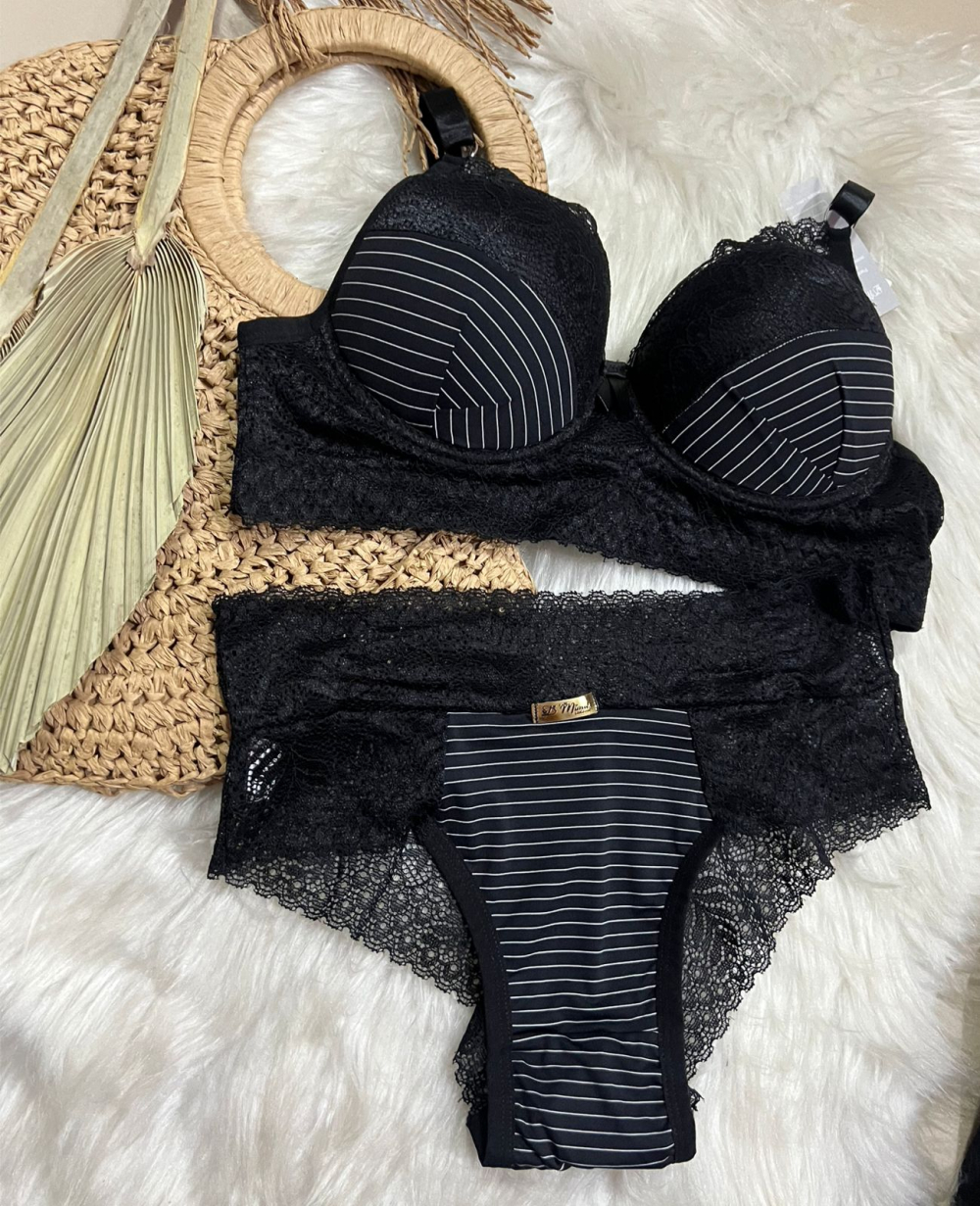 Conjunto com calcinha e sutiã com bojo sem bolha, em renda e microfibra.