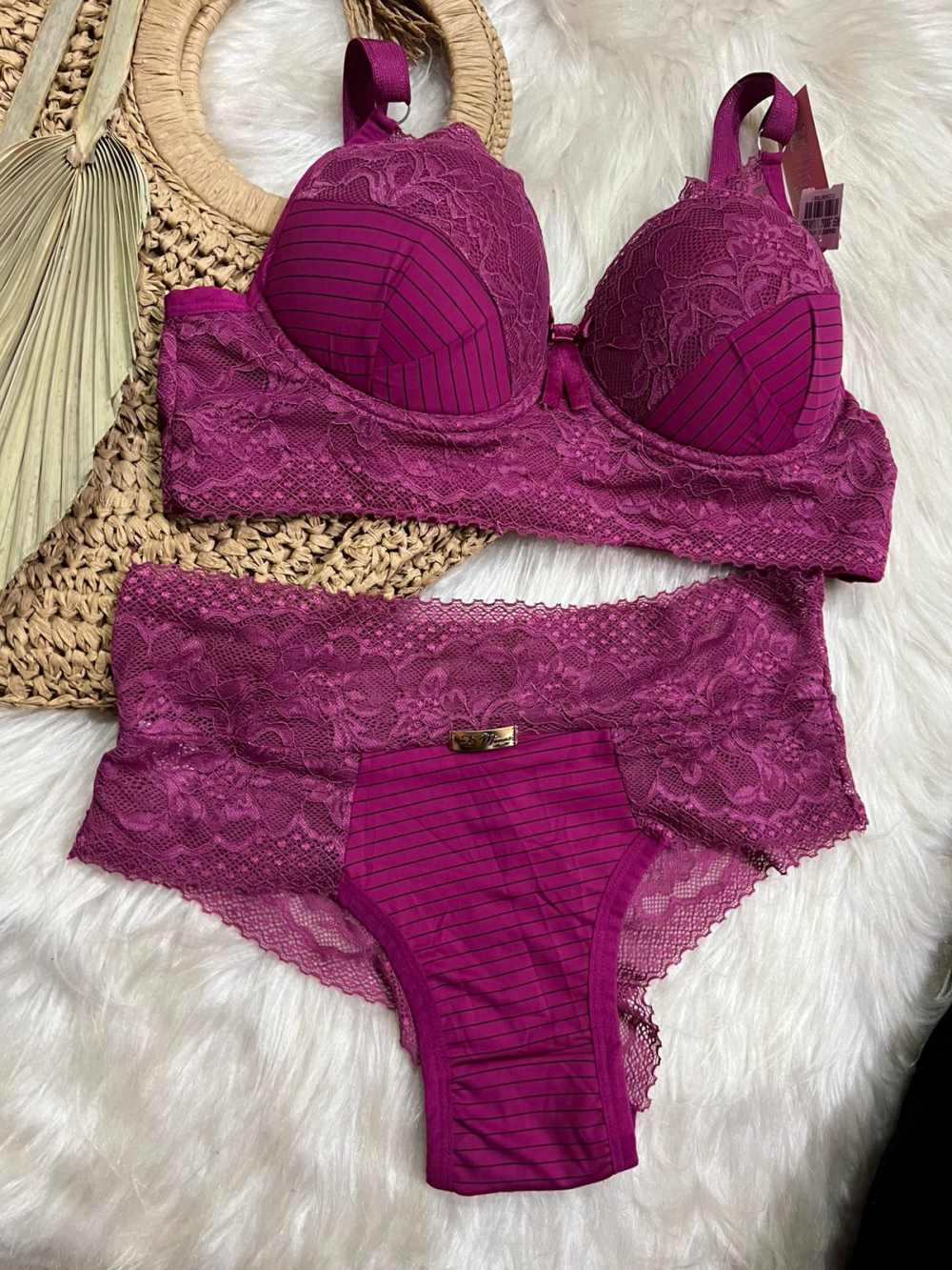 Conjunto com calcinha e sutiã com bojo sem bolha, em renda e microfibra.
