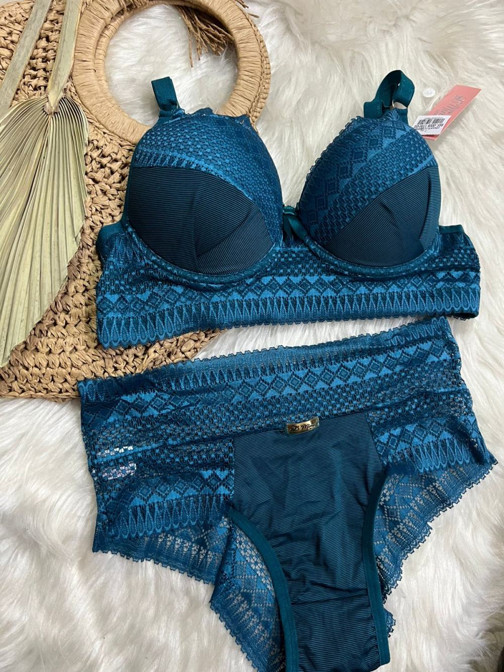 Conjunto com calcinha e sutiã com bojo sem bolha, em renda e microfibra.