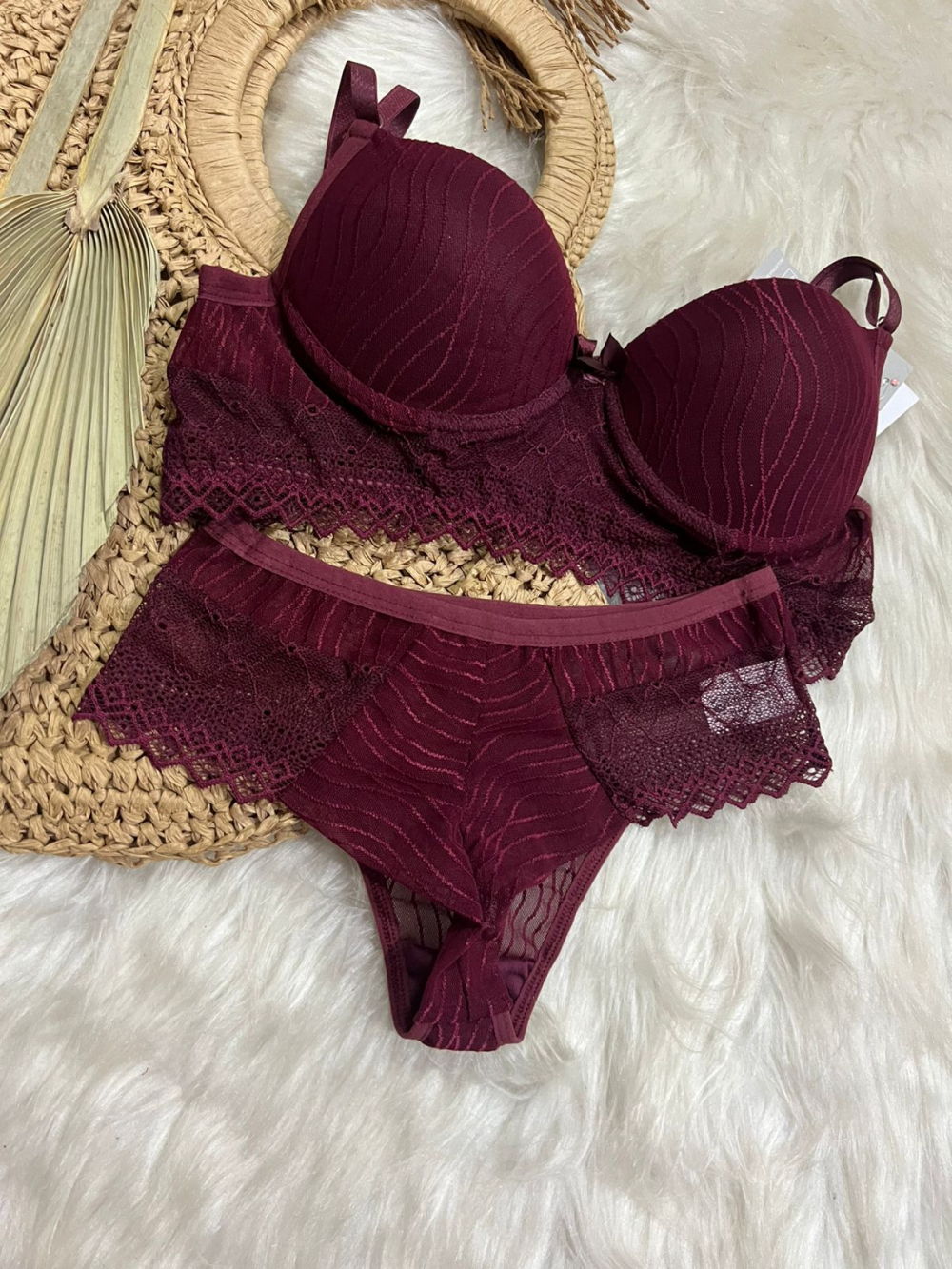 Conjunto com calcinha e sutiã com bojo com bolha, em renda e microfibra.