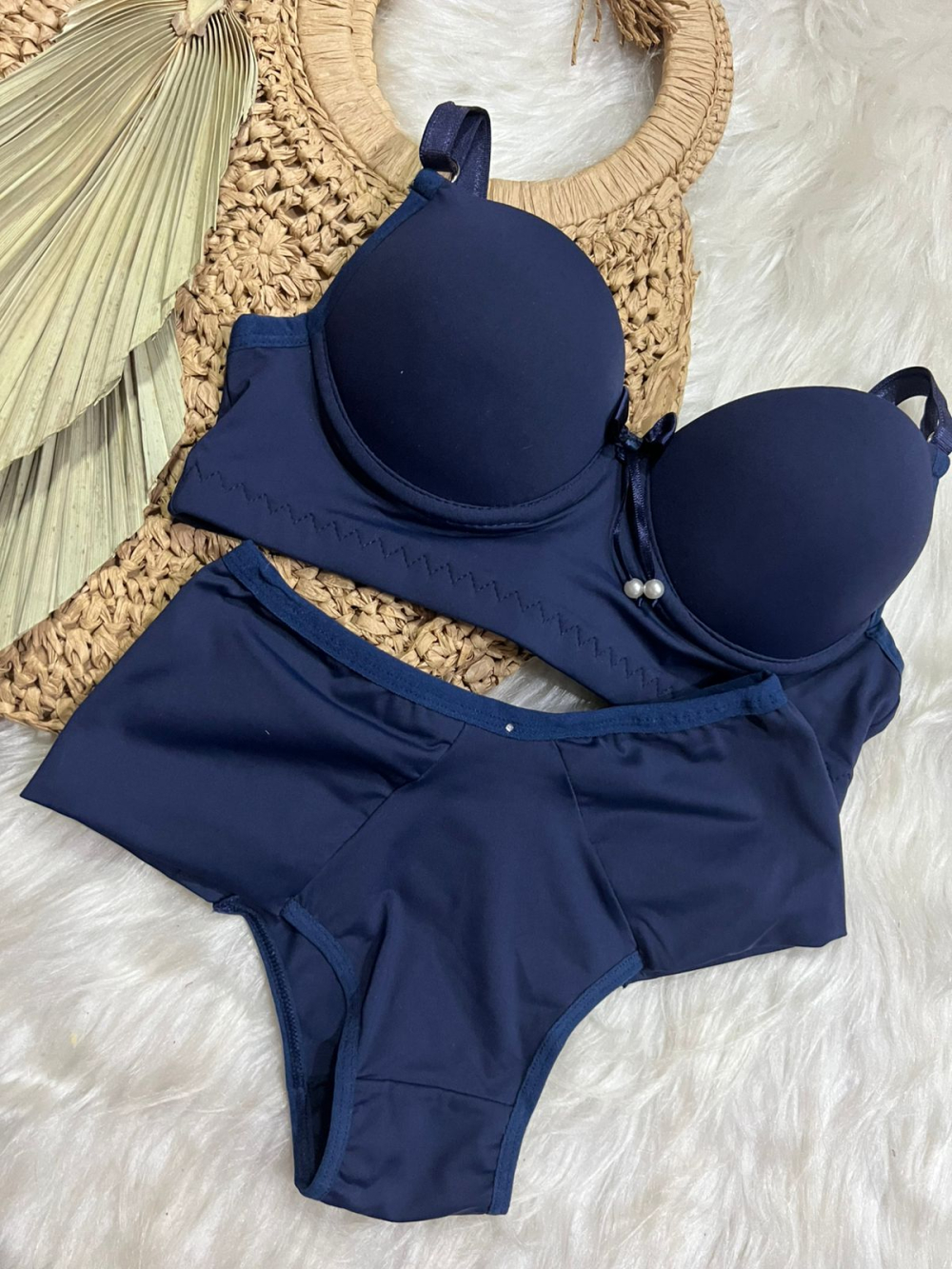 Conjunto com calcinha e sutiã com bojo com bolha, em renda e microfibra.