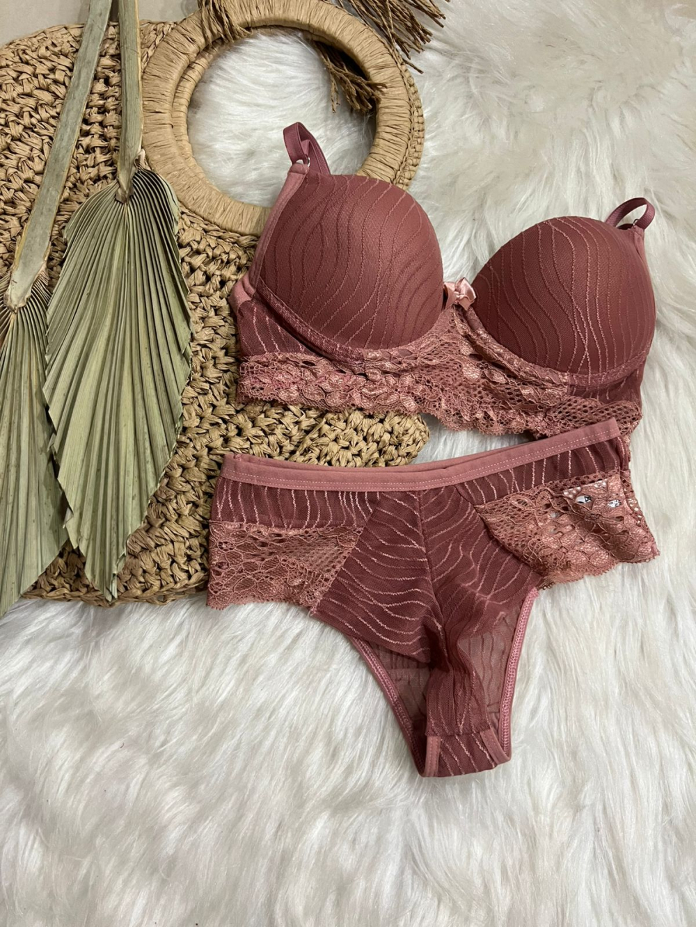 Conjunto com calcinha e sutiã com bojo com bolha, em renda e microfibra.