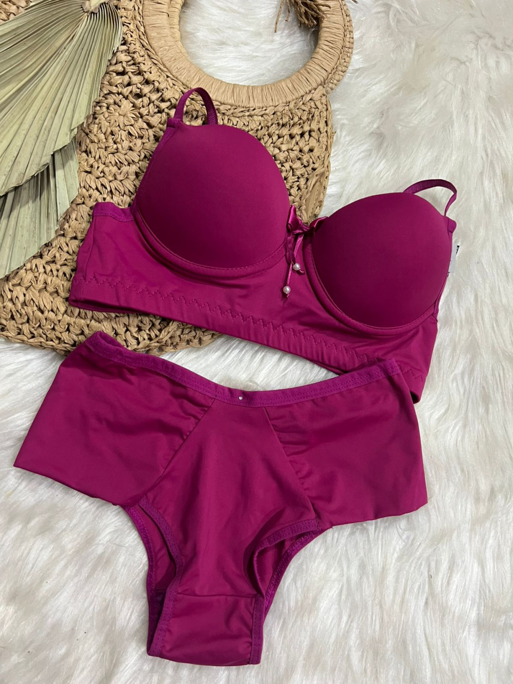 Conjunto com calcinha e sutiã com bojo com bolha, em renda e microfibra.