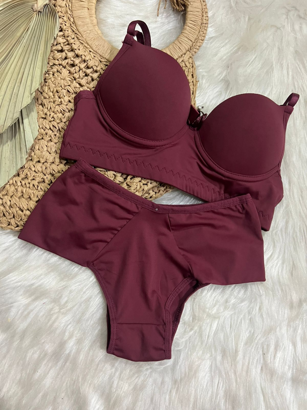 Conjunto com calcinha e sutiã com bojo com bolha, em renda e microfibra.