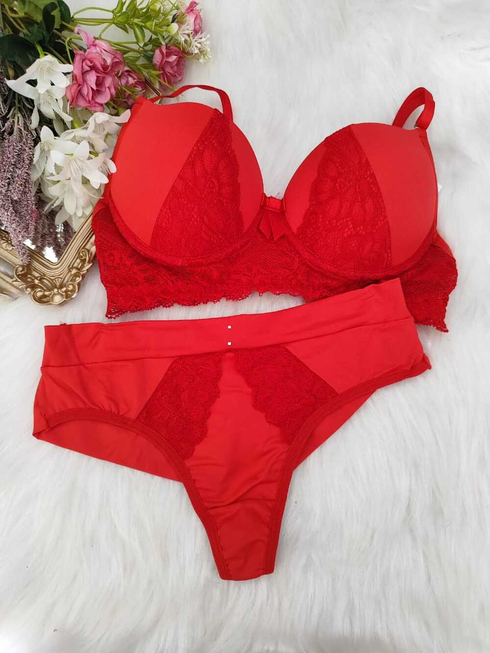 Conjunto com calcinha e sutiã com bojo com bolha, em renda e microfibra.